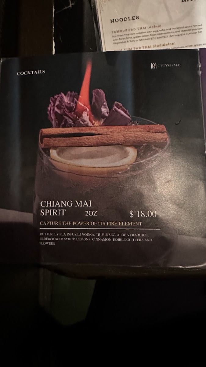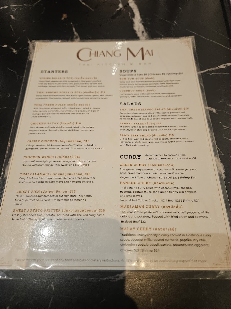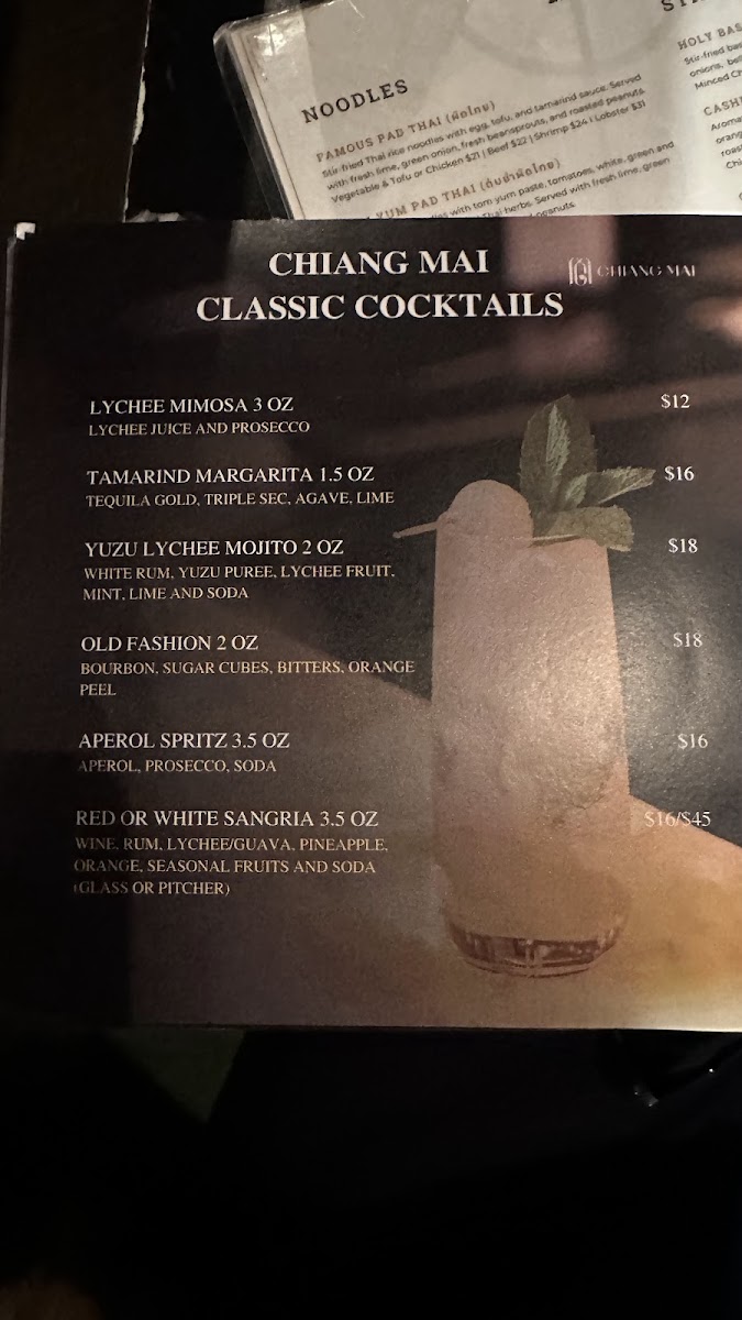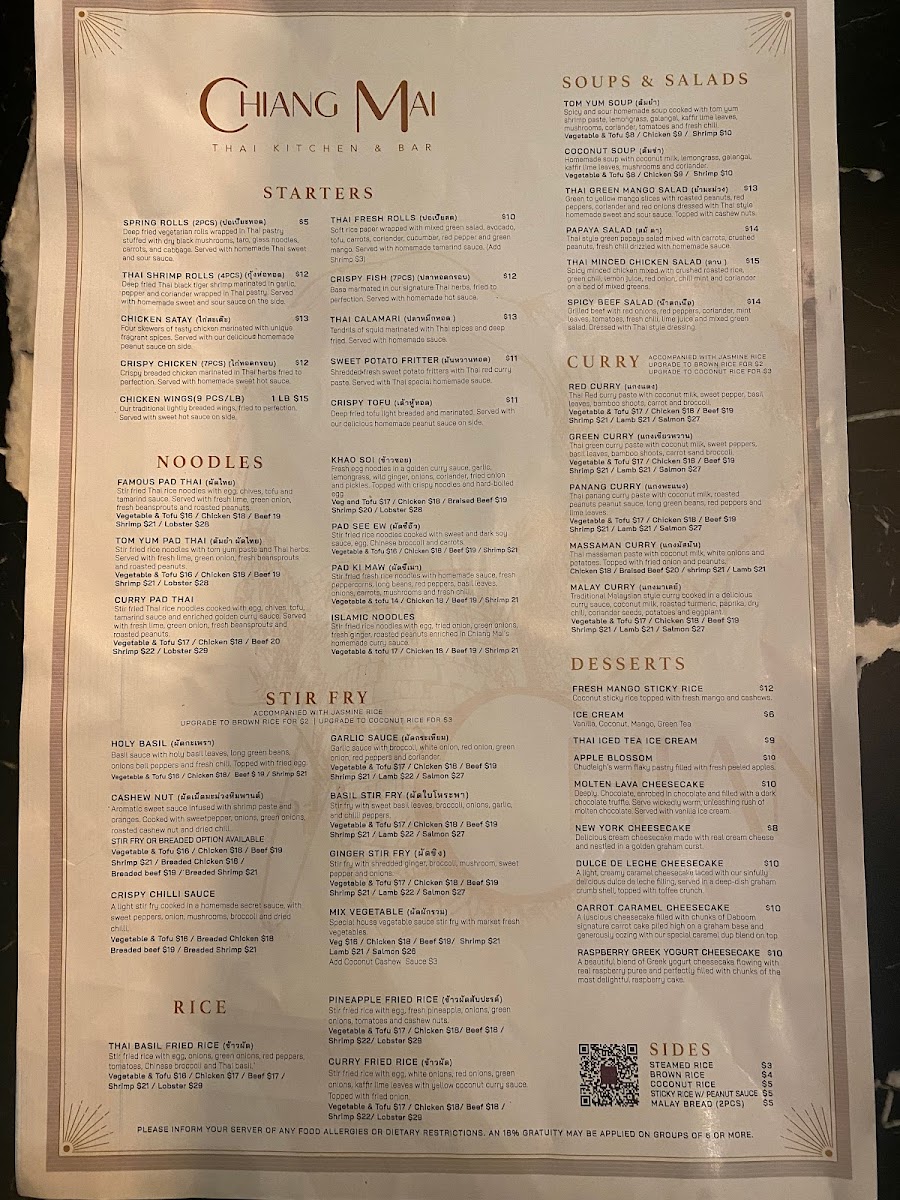 The menu at Chiang Mai Liberty offers a variety of traditional Thai dishes along with beverages and desserts, suitable for casual dining throughout the day. The food selections include appetizers such as spring rolls and Thai shrimp rolls, followed by main dishes featuring classic Thai curries like green curry and Panang curry, as well as noodle dishes including the well-known Pad Thai and Pad See Ew. There are also specialty bowls, such as the Chilli Lime Spicy Bowl with seared tuna and the Pad Gra Pao Bowl with minced chicken served over ginger rice.