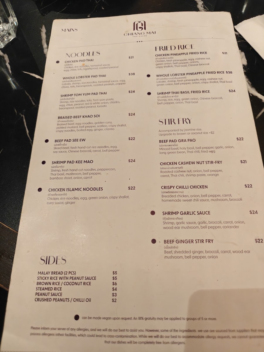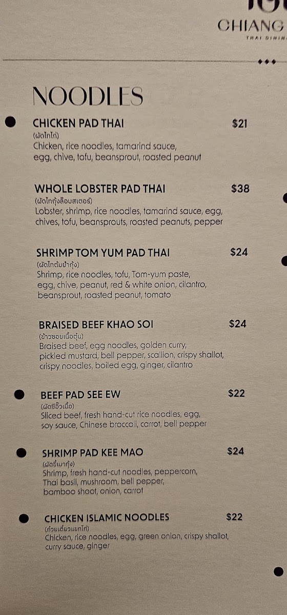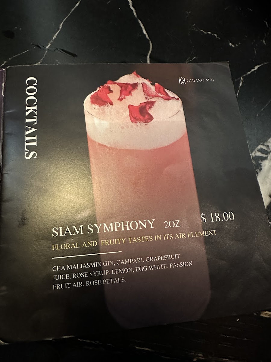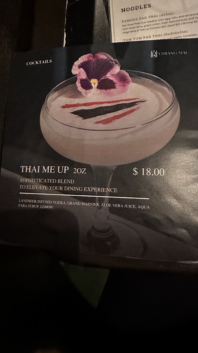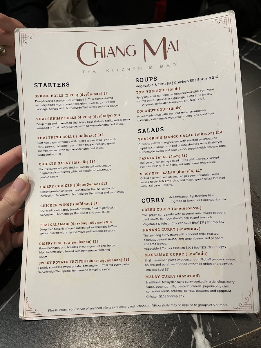 The menu at Chiang Mai Liberty offers a variety of traditional Thai dishes along with beverages and desserts, suitable for casual dining throughout the day. The food selections include appetizers such as spring rolls and Thai shrimp rolls, followed by main dishes featuring classic Thai curries like green curry and Panang curry, as well as noodle dishes including the well-known Pad Thai and Pad See Ew. There are also specialty bowls, such as the Chilli Lime Spicy Bowl with seared tuna and the Pad Gra Pao Bowl with minced chicken served over ginger rice.